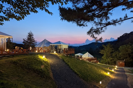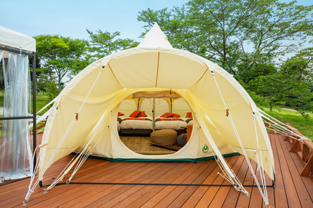 スパリゾートハワイアンズゴルフコース専用バーベキューテラス付きのテントで、開放感あふれるキャンプと快適なホテルステイの良いとこ取り!思い出に残る特別な体験を。